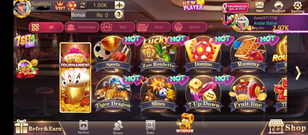Explore various game modes like Classic Teen Patti, tournaments, or private tables.
